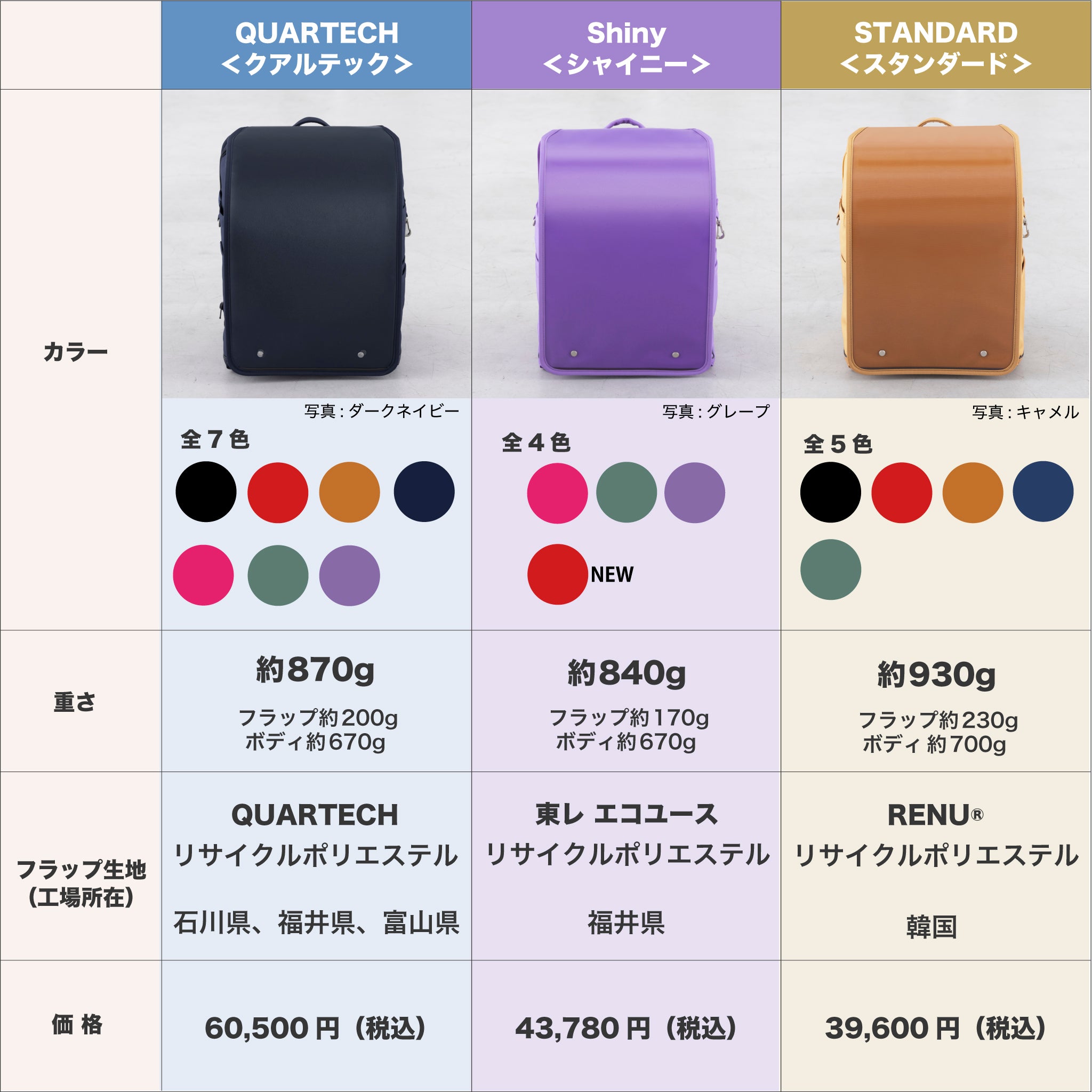 今年は「選べるフラップ」として、トレンドの4色は、光沢感のあるShiny<シャイニー>と、革のような質感の「QUARTECH」モデルの2つのラインナップをご用意。